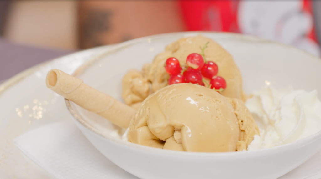 Uno de nuestros favoritos es el helado de turrón, cremoso y lleno de sabor, que te transporta a los sabores más típicos de las fiestas, pero disponible en cualquier época del año. Servido con una base crujiente de galleta y un toque de caramelo salado, es la fusión perfecta entre lo clásico y lo contemporáneo.